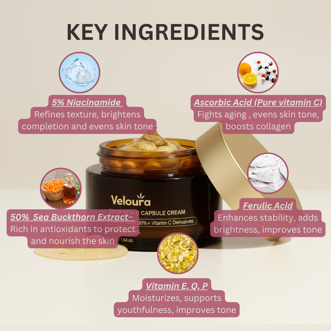 A dual-texture vitamin-C system with vitamin C (ascorbic acid), niacinamide (5%), sea buckthorn extract (50%), antioxidant co-factors (ferulic acid + vitamins E/Q/P), and a fragrance component. Full INCI is printed on the box and on this page.