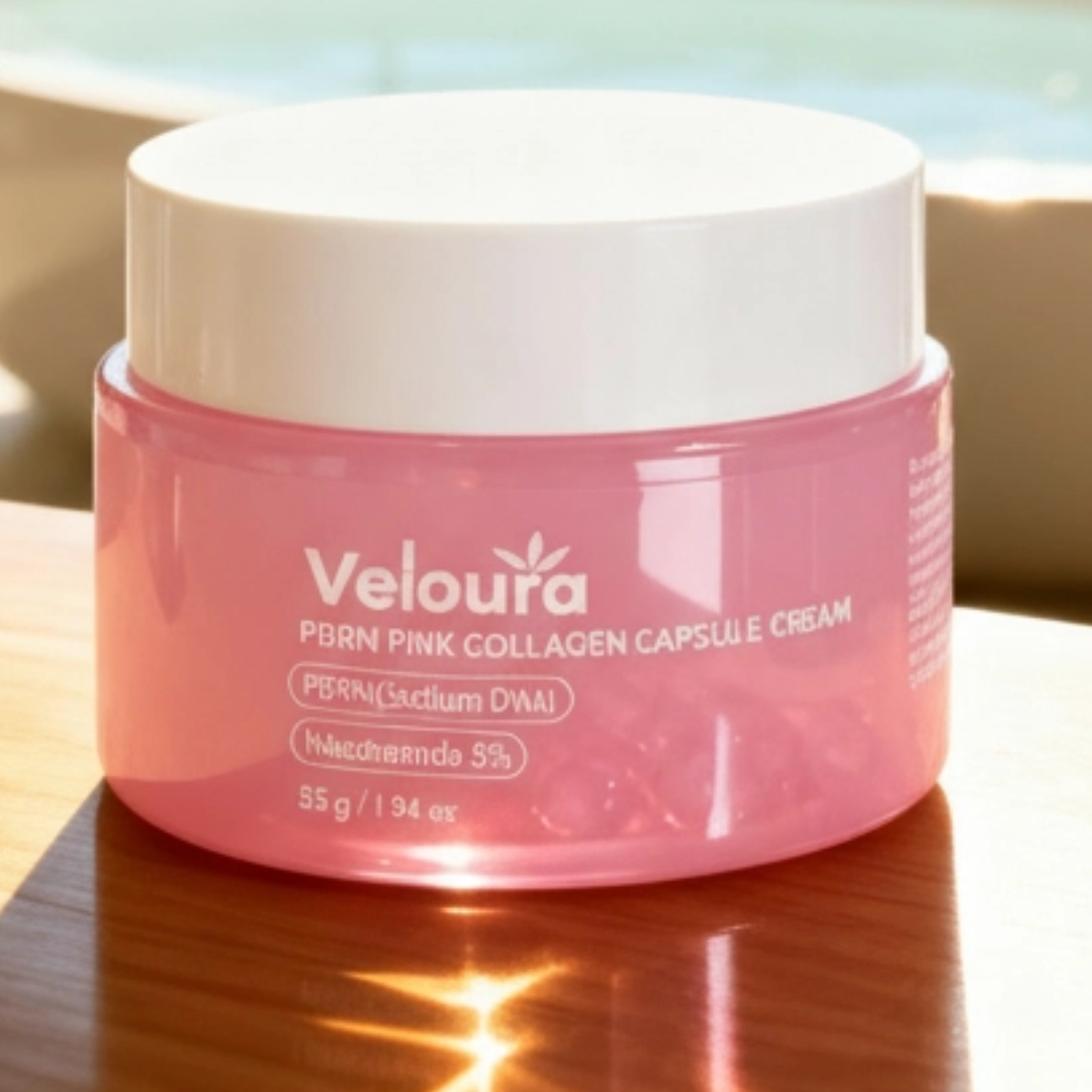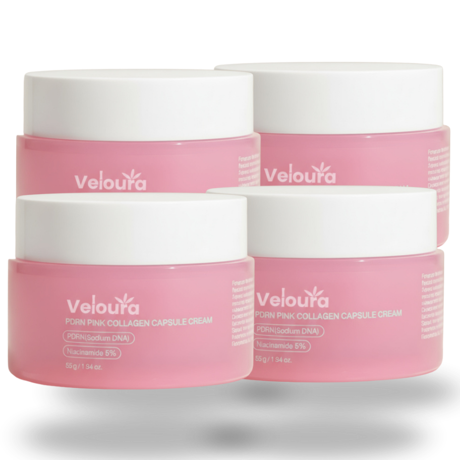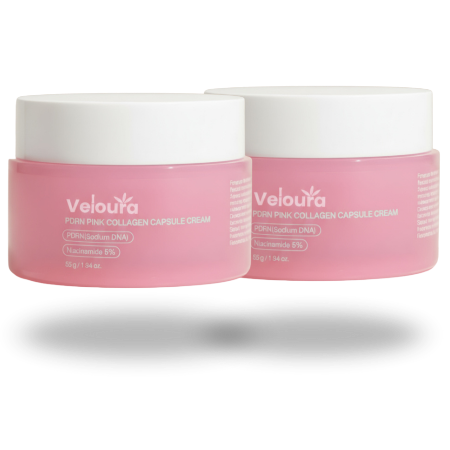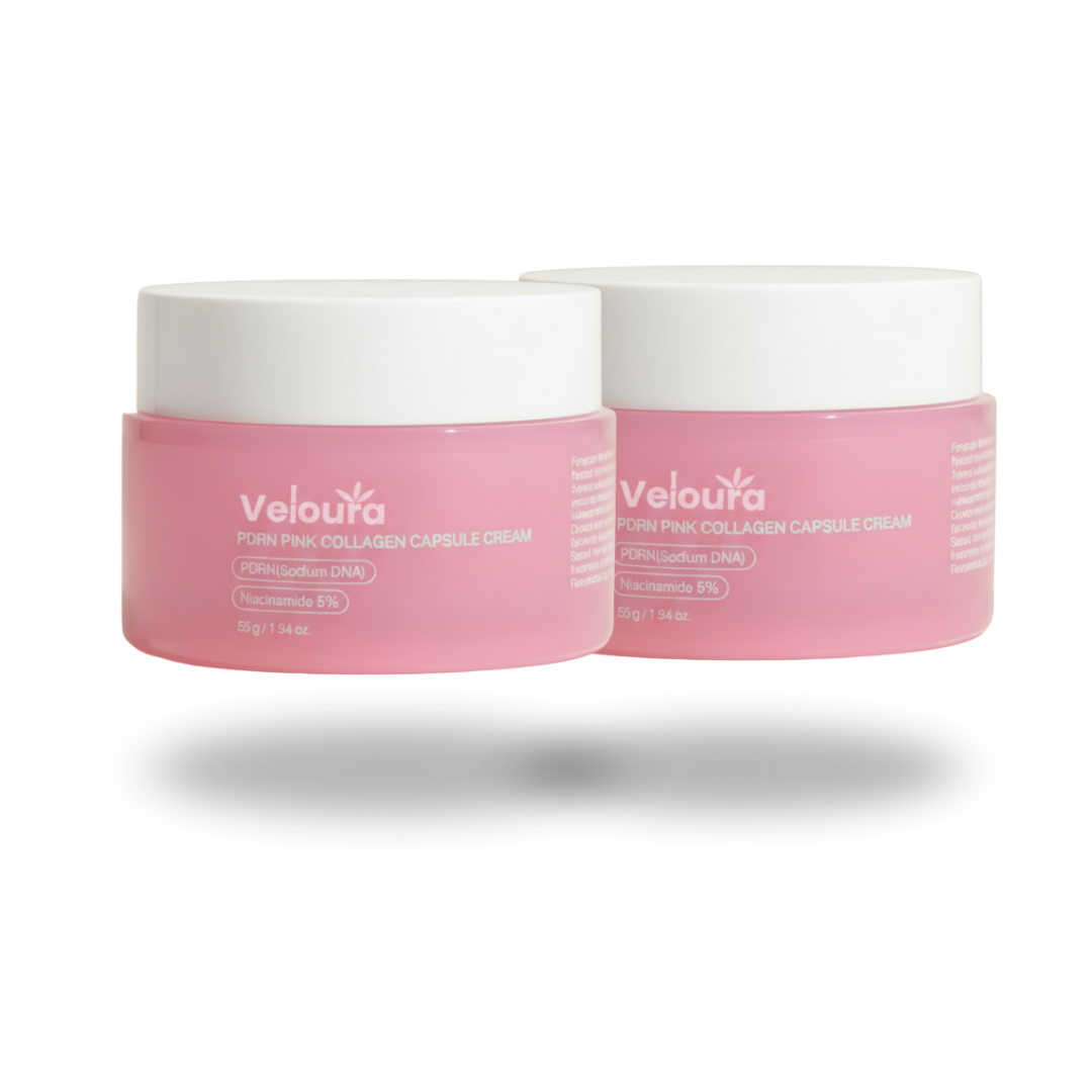 Veloura is formulated with PDRN (Sodium DNA), Marine Collagen Capsules, a Hyaluronic Acid Complex, Niacinamide, Adenosine, and skin-soothing emollients.